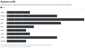 A cada três dias, um novo caso de racismo é registrado no Rio Grande do Norte. Os dados estão em um boletim da Secretaria da Segurança Pública e da Defesa Social (Sesed-RN), que compilou as ocorrências de discriminação pela cor da pele entre os meses de janeiro e setembro deste ano. Ao todo, foram contabilizados 89 registros no período.