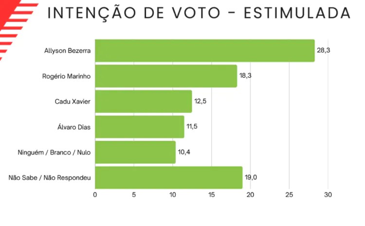 Pesquisa realizada pelo Instituto Seta nos dias 12 e 13 de outubro em Brejinho mostra Allyson Bezerra (União Brasil) na liderança para o Governo do Rio Grande do Norte, tanto na espontânea quanto na estimulada.