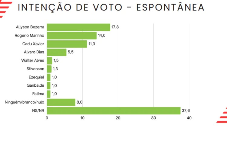 Na espontânea, Allyson tem 17,8%, seguido por Rogério Marinho (14%) e Cadu Xavier (11,3%).