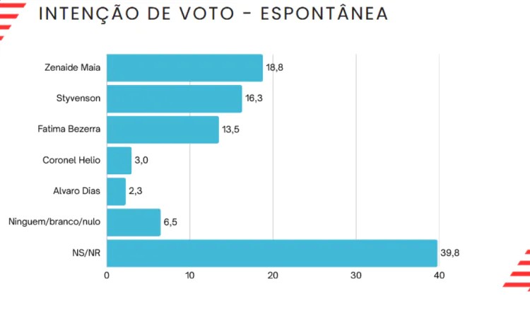 Para o Senado, a senadora Zenaide Maia lidera a disputa espontânea com 18,8%, seguida por Styvenson Valentim (16,3%) e Fátima Bezerra (13,5%).