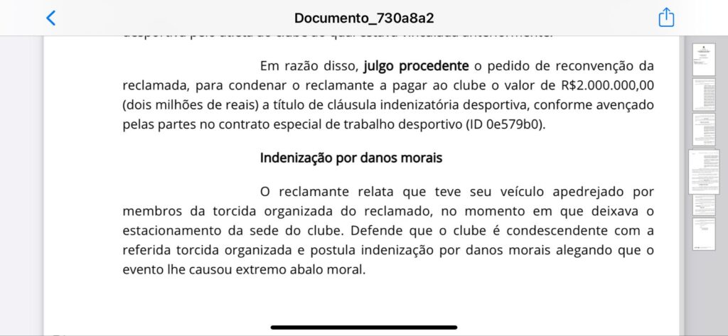 O juiz reconheceu que o contrato foi rescindido por inciativa do atacante e o condenou ao pagamento de R$ 2 milhões ao clube por esse ser a cláusula indenizatória prevista.