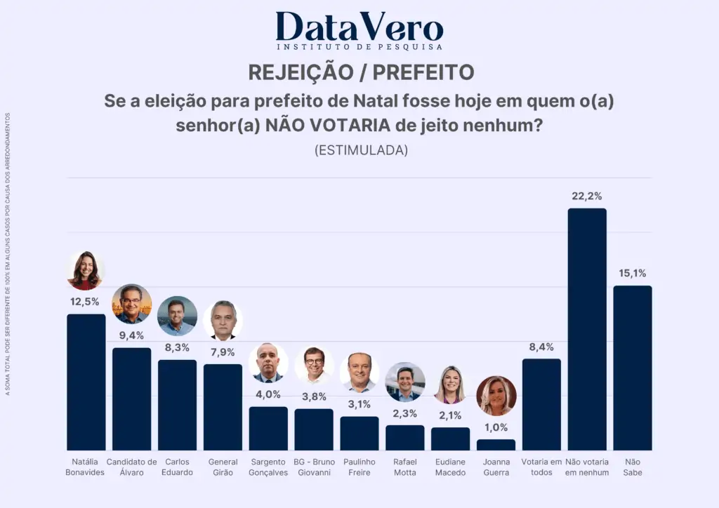 E a pré-candidata do PT, a deputada Natália Bonavides, lidera a lista, com 12,5% das citações, sendo seguido pelo candidato de Álvaro Dias, em 2º lugar, na rejeição dos natalenses com 9,4%. Já o ex-prefeito Carlos Eduardo está em 3º lugar, com 8,3% .
