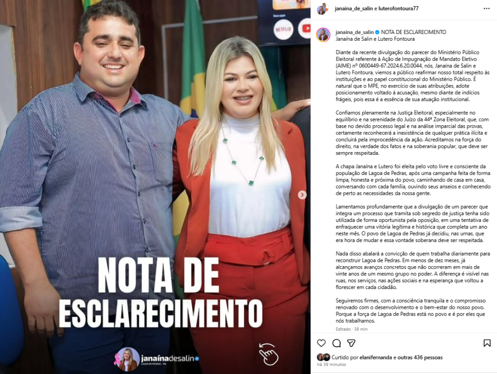 A prefeita e vice-prefeito do município de Lagoa de Pedras, Janaína de Salin e Lutero Fontoura, respectivamente, usaram as redes sociais para publicar uma nota de esclarecimento. A prefeita e Vice, emitiram a nota para falarem do parecer do Ministério Público eleitoral em que pede a cassação deles.
