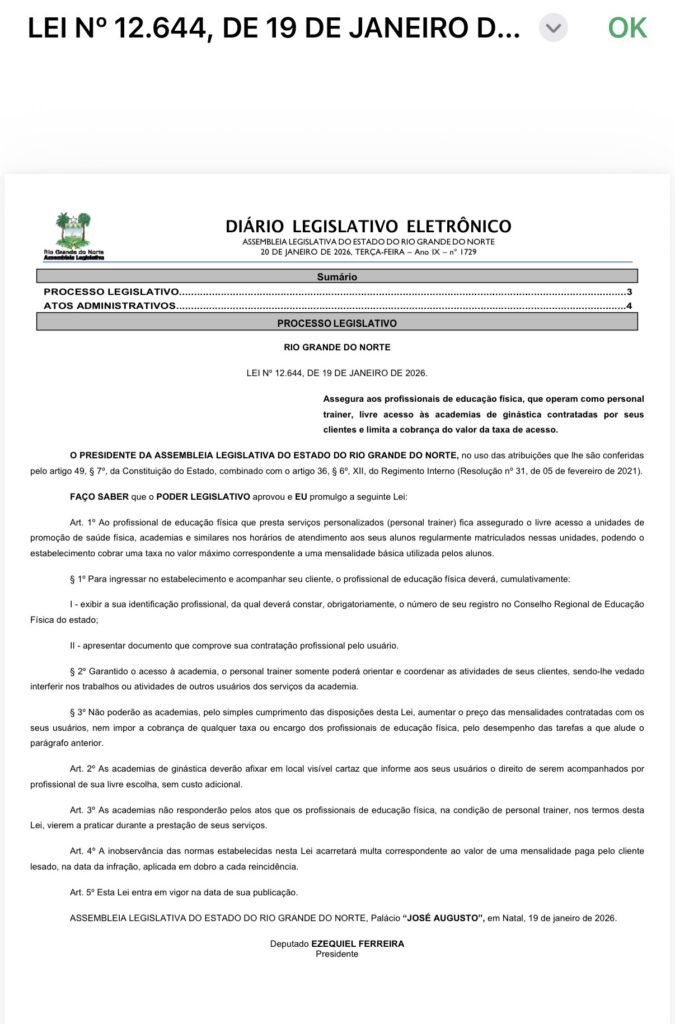 A Lei nº 12.644/2026 garante aos profissionais de educação física, na função de personal trainer, livre acesso às academias contratadas por seus clientes e limita a cobrança de taxas a, no máximo, uma mensalidade básica. O texto protege o aluno e fortalece a atuação dos personais, além de proibir aumento de mensalidades ou criação de taxas extras em razão desse acompanhamento.