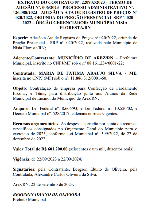 A contratação é oriunda da adesão da licitação da prefeitura de Nísia Floresta, que teve como contratada a empresa “MARIA DE FÁTIMA ARAÚJO SILVA – ME”, e teve como valor total de R$ Valor Total de R$ 601.200,00 (seiscentos e um mil, duzentos reais);