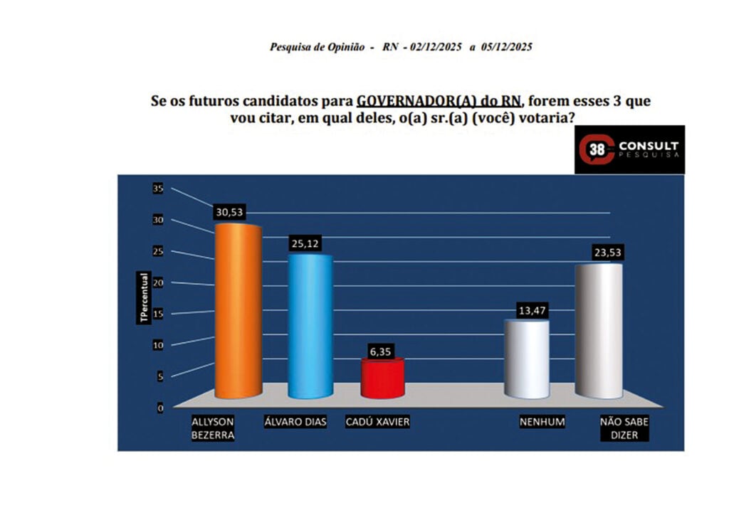 A última pesquisa Consult deste ano pré-eleitoral no Rio Grande do Norte aponta para uma disputa acirrada pelo Governo do Estado. Segundo os números, Allyson Bezerra (União) registrou 30,47%, enquanto o senador Rogério Marinho (PL) chegou a 28,76%. Uma diferença de 1,71 ponto percentual. Um empate técnico, já que a margem de erro é de 2,3%. No mesmo cenário, o secretário estadual da Fazenda, Carlos Eduardo Xavier (PT) surge com 6,41%. Não sabe dizer somou 21% e nenhum 13,35%.