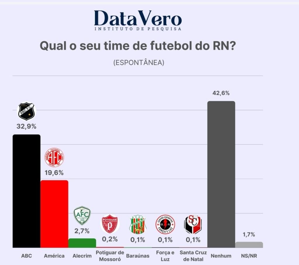 Sempre há essa discussão de qual seria o time do Rio Grande do Norte com a maior torcida. ABC e América são os maiores e isso é um fato. Uma pesquisa espontânea do instituto DataVero, divulgada nesta quarta-feira (25) pelo jornal Diário do RN, mostra um número chamativo: o ABC lidera as respostas populares, mas com uma distância, no meu ponto de vista, desproporcional.