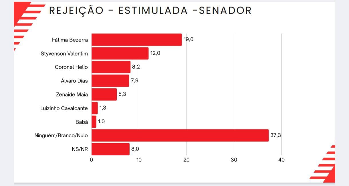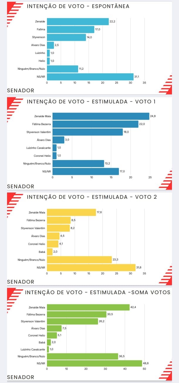 No voto estimulado, quando os nomes são apresentados, Zenaide Maia mantém a liderança no Voto 1, com 24,8%, seguida por Fátima Bezerra (22,0%) e Styvenson Valentim (18,0%). Já no Voto 2, o cenário muda: Zenaide continua na frente, com 17,6%, mas há maior dispersão dos votos, com Fátima (8,5%), Styvenson (8,2%), Álvaro Dias (4,5%) e Coronel Hélio (4,1%). Os índices de branco/nulo (23,3%) e NS/NR (31,8%) seguem elevados, reforçando a ideia de indefinição sobre a segunda escolha.