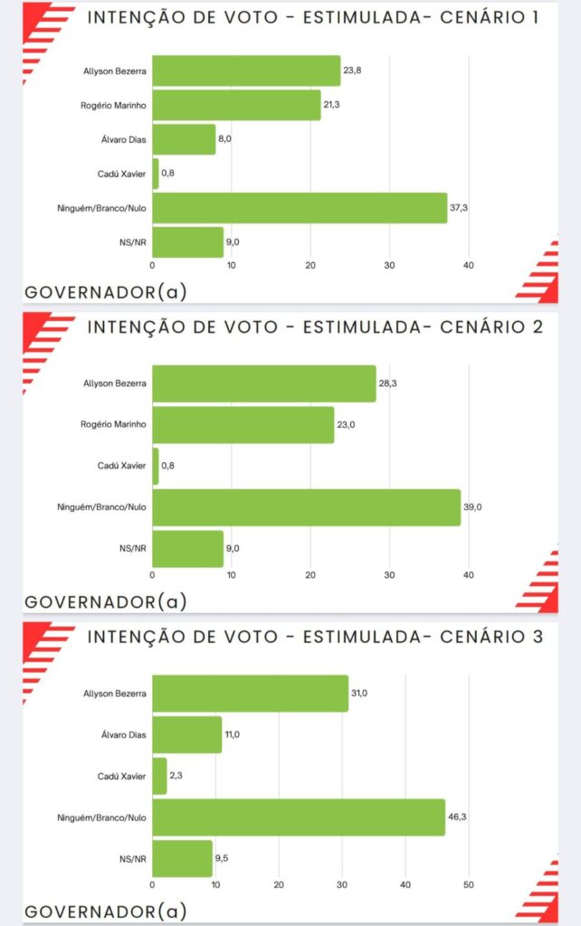 No cenário 2, Allyson amplia a vantagem e alcança 28,3%, enquanto Rogério Marinho soma 23,0%. Cadu Xavier mantém 0,8%. O percentual de eleitores que declaram voto em nenhum, branco ou nulo sobe para 39,0%, com 9,0% de NS/NR, reforçando o grau de indefinição do eleitorado dentro da margem de erro do estudo.