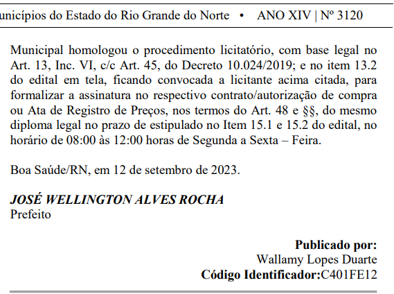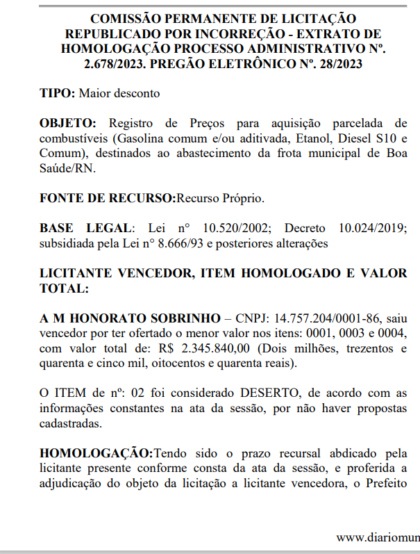 O Diário Oficial dos municípios do Rio Grande do Norte (FEMURN), trouxe nesta segunda-feira (18) a homologação de uma licitação milionária no na cidade de Boa Saúde no Agreste potiguar.