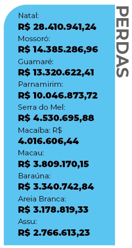 Segundo dados da Secretaria de Estado da Fazenda, pelo menos 32 dos 167 municípios potiguares terão perdas que passarão de R$ 1 milhão com a redução da alíquota para 18%. Natal terá o maior corte, liderando o ranking, com uma perda estimada em R$ 28,4 milhões, seguido por Mossoró, que enfrentará uma redução de R$ 14,3 milhões. Guamaré, Parnamirim e Serra do Mel também estão entre os municípios mais afetados, com perdas de R$ 13,3 milhões, R$ 10 milhões e R$ 4,5 milhões, respectivamente.