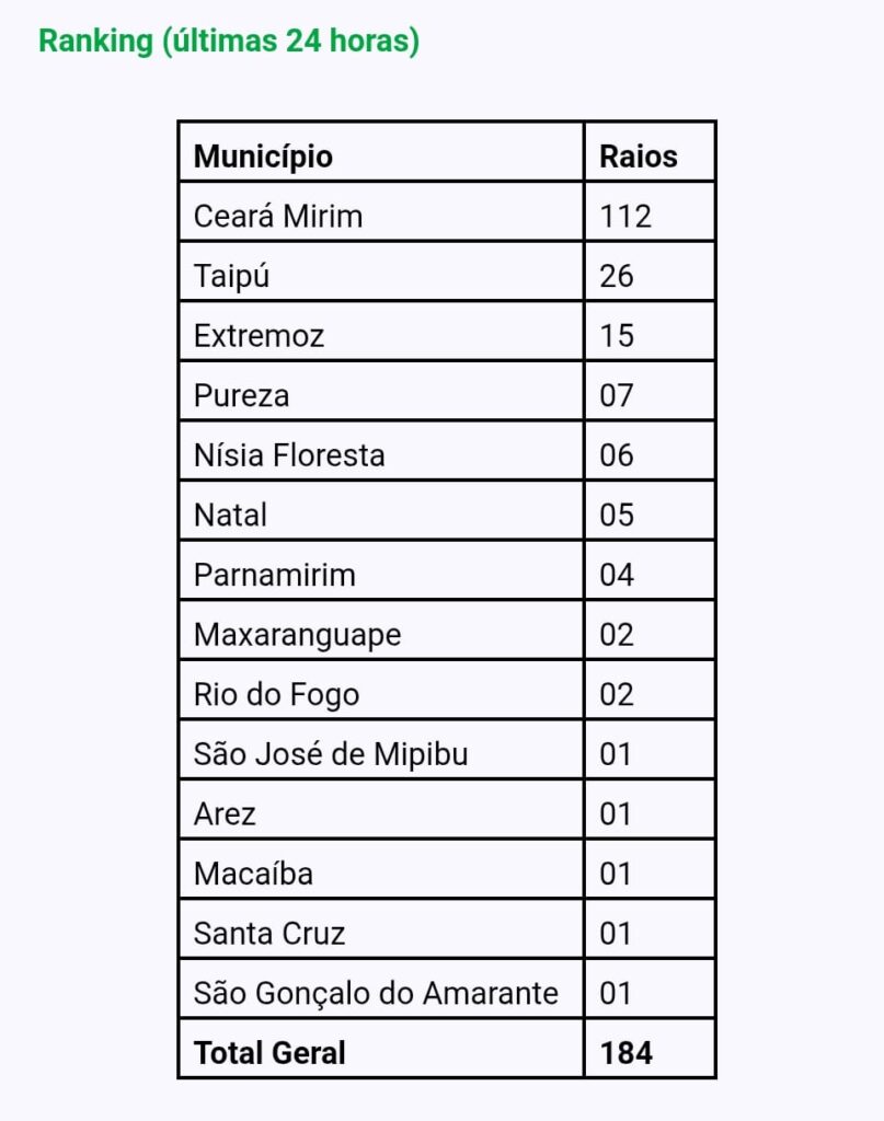 13 municípios da Região Metropolitana de Natal, além de Santa Cruz, no Trairi, foram atingidos por 184 raios em 24 horas, entre 8h40 da terça-feira (10) e 8h40 da quarta-feira (11), conforme levantamento da Neoenergia Cosern com base em dados da Plataforma Climatempo. Os municípios mais atingidos foram Ceará Mirim, com 112 registos, Taipu, com 26 descargas, e Extremoz, com 15 raios. Em Ceará Mirim, 02 raios atingiram parte da subestação elétrica da Neoenergia Cosern por volta das 5h da manhã e cerca de 18 mil unidades consumidoras tiveram o serviço interrompido por cerca uma hora.