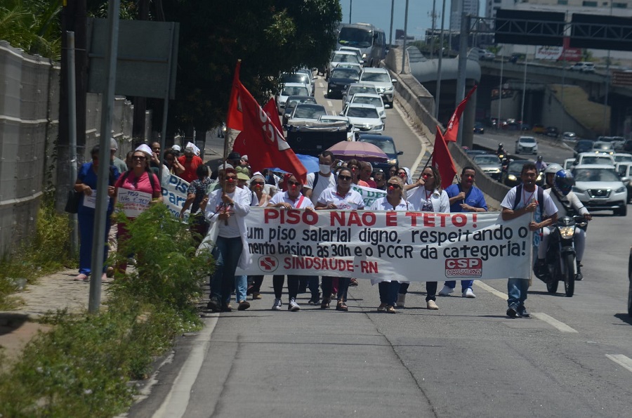 “O Governo do Estado está pegando insalubridade, plantão noturno, produtividade e outros benefícios e está colocando em cima do vencimento básico para chegar ao piso. É uma perda gigantesca em cima da Lei 14.434. Estamos nas ruas cobrando o pagamento para trabalhadores do Estado”, disse o coordenador do Sindsaúde/RN, Carlos Alexandre.