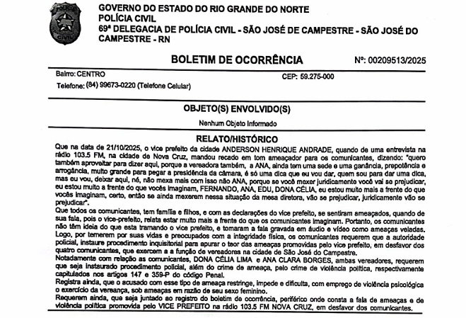Vereadores de São José do Campestre registraram boletim de ocorrência contra o vice-prefeito Anderson Henrique Andrade, depois de declarações consideradas ameaçadoras durante entrevista na rádio 103.5 FM, em Nova Cruz, na última quinta-feira (23). Segundo o registro, Andrade teria dito que “estava muito à frente do que imaginam” e alertado que quem “mexesse juridicamente na situação da mesa diretora” poderia se “prejudicar juridicamente”.